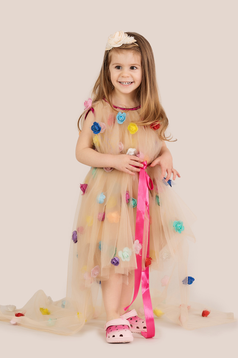 Îmbrățișați magia și eleganța cu Rochia Princess, o adevărată capodoperă creată pentru a transforma orice zi într-un moment de basm pentru micuța dumneavoastră prințesă. Fiecare detaliu al acestei rochii a fost gândit pentru a aduce un zâmbet de bucurie și admirație pe chipul fetiței dumneavoastră, transformând-o în vedeta oricărui eveniment la care participă. Cu o siluetă încântătoare și o trena lungă care adaugă un aer de grațios, Rochia Princess este confecționată din materiale de înaltă calitate, delicate la atingere dar suficient de rezistente pentru a înfrunta entuziasmul și energia specifică vârstei. Trandafirii multicolori aplicati pe suprafața rochiei aduc o explozie de culoare și veselie, transformând fiecare pirueta într-un dans de petale fermecate. Creată special pentru fetele cu vârste între 3 și 10 ani, această rochie este mai mult decât un simplu articol de îmbrăcăminte - este o invitație la visare și magie, o ocazie pentru micuța dumneavoastră să se simtă ca adevărate prințese în lumea reală. Fie că participă la o petrecere aniversară, la un spectacol școlar sau la un eveniment, în Rochia Princess va străluci și va atrage toate privirile, fiind în centrul atenției.